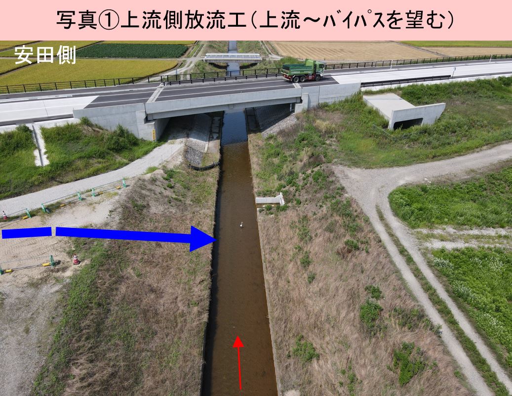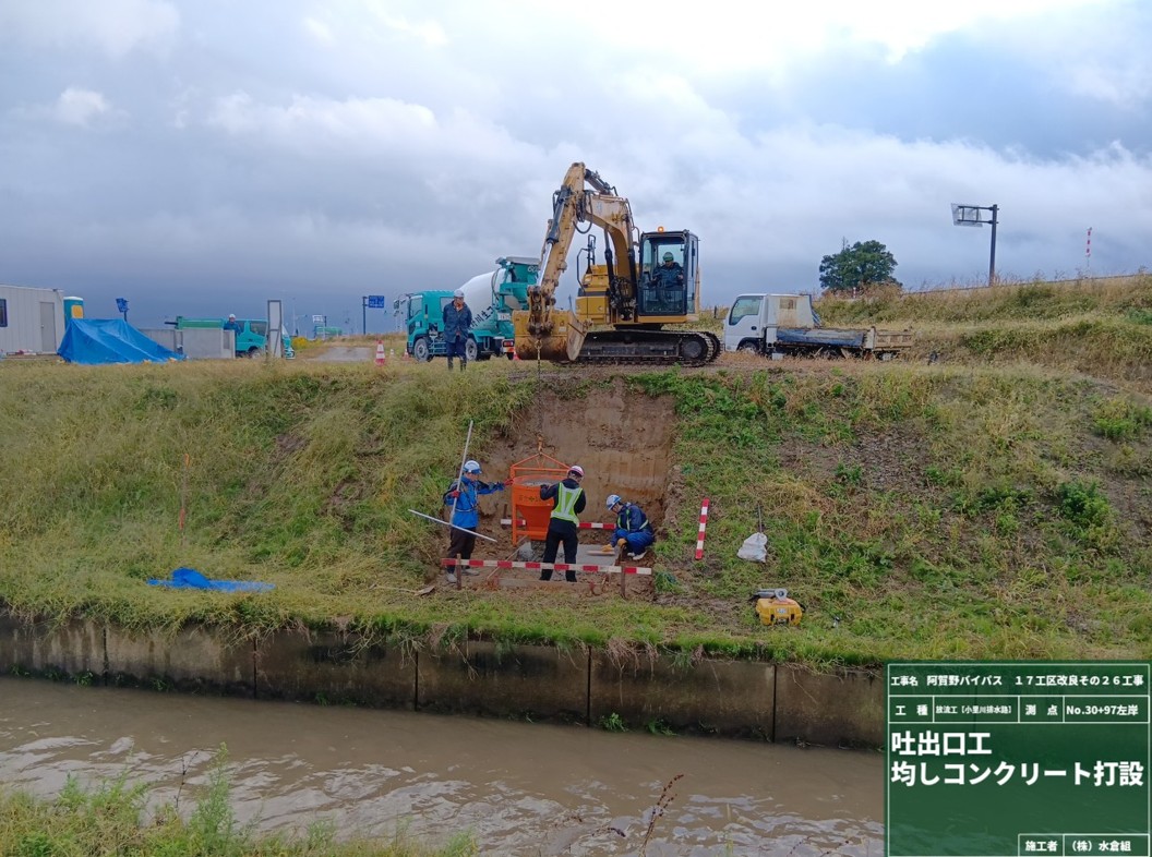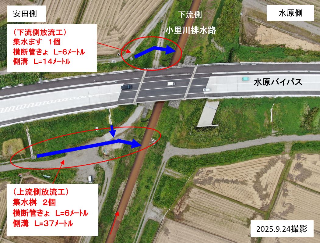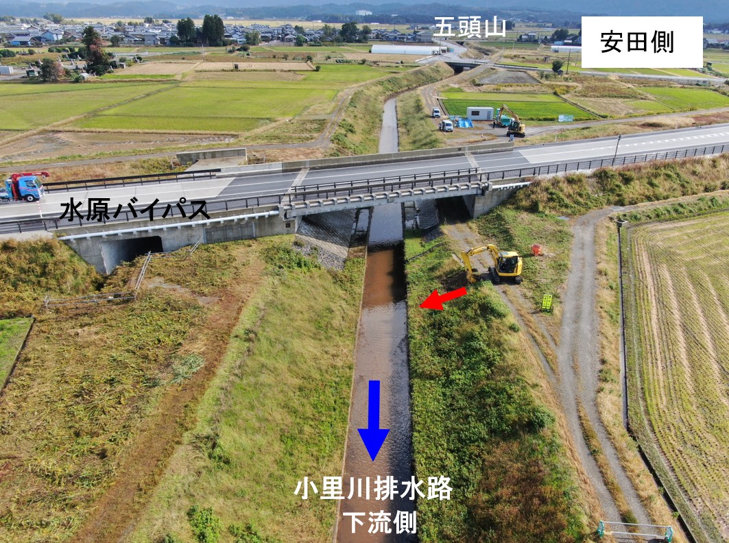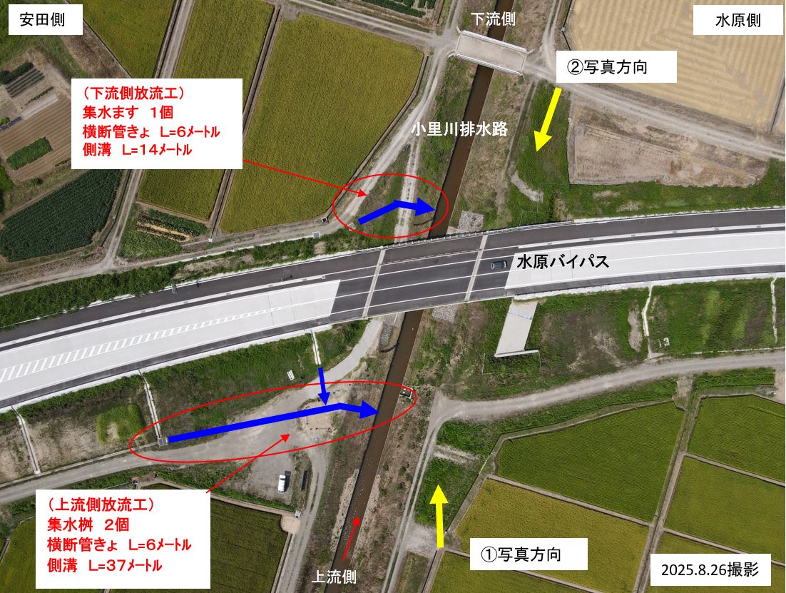 ○水原バイパス小里川排水路、上流側と下流側で放流工の作業をおこなっています。