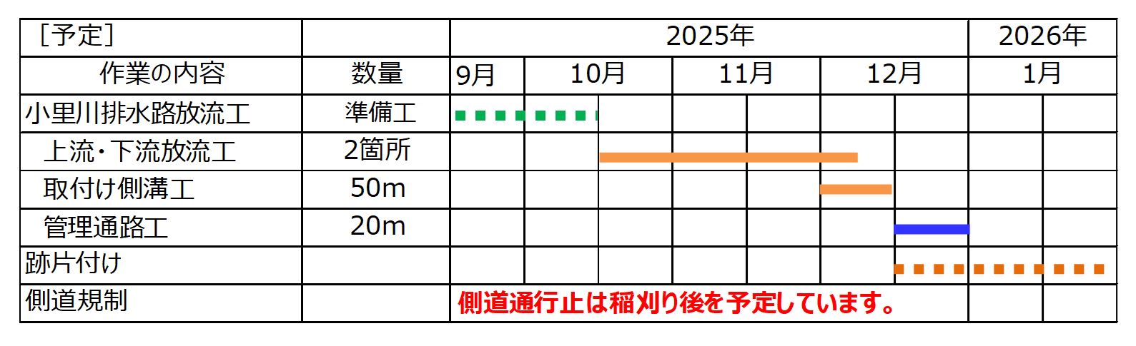 ➀側道の通行止めは稲刈り後に予定しています。