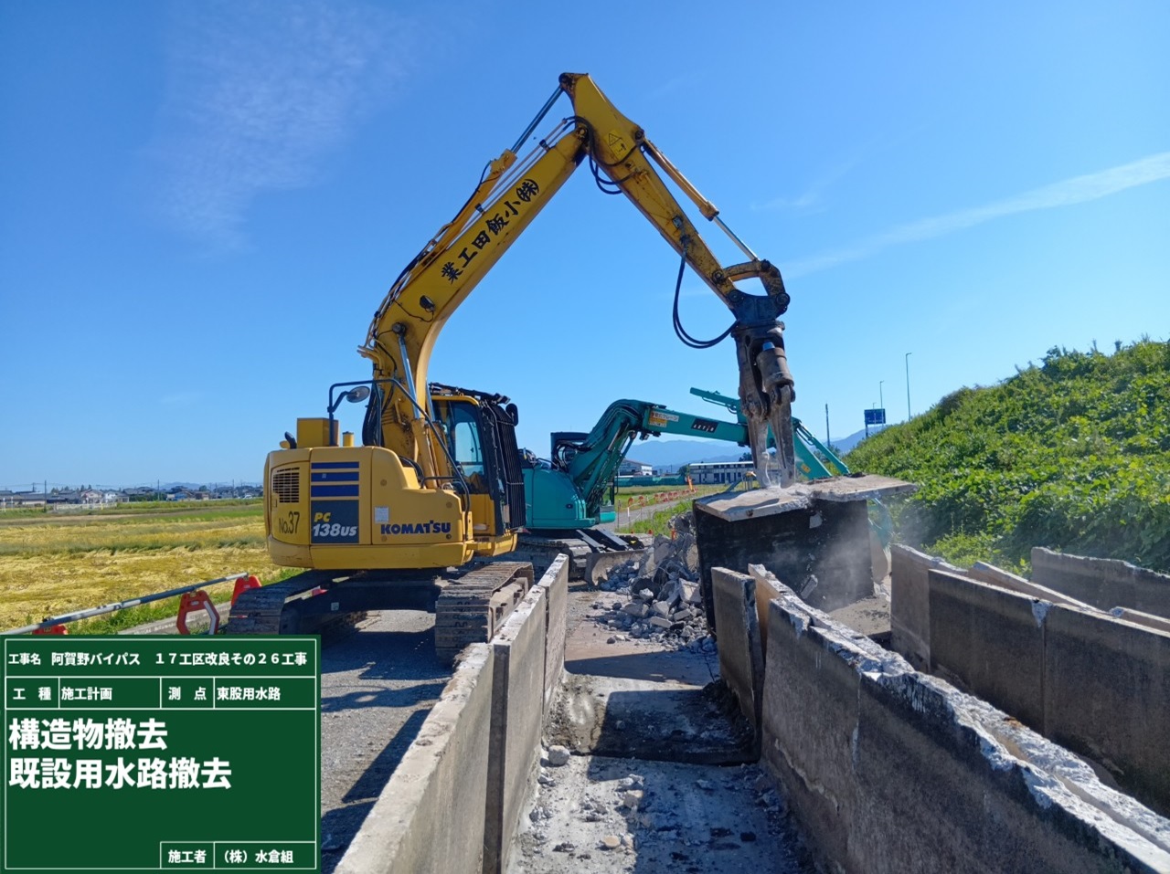 ガードレールを外して、大型のバックホウ(掘る機械と水路をこわす機械)をもってきます。